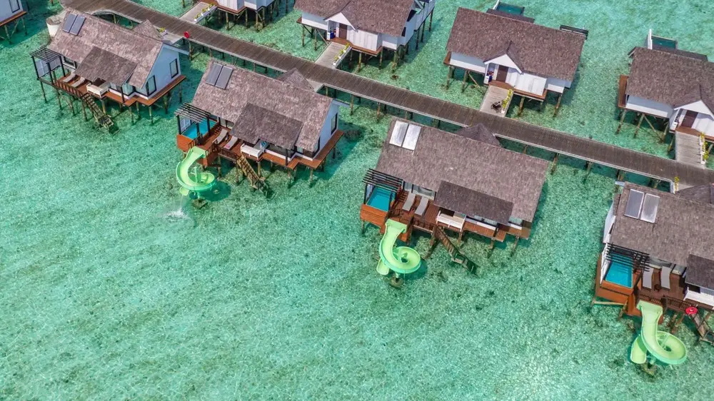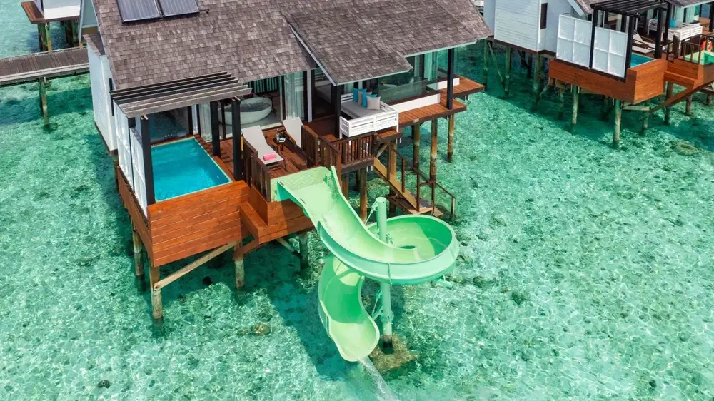 특히 선셋 워터풀빌라 위드 슬라이드 객실은 선셋은 물론 아름다운 보석빛 라군을 향해 있으니, 18m의 워터 슬라이드에서 오는 액티브함은 물론 몰디브 감성까지 제대로 느껴보고 싶다면, 선셋 워터풀빌라 위드 슬라이드 객실을 추천한다.