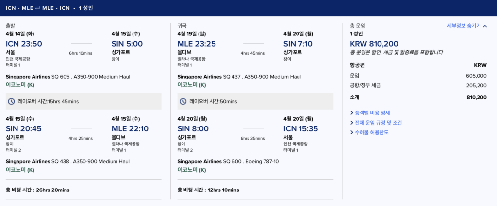 물론, 인천-몰디브 노선의 경우 특가 요금에 해당하는 항공편은 몰디브에 밤 늦은 시간 도착하는 노선으로 한국 신혼부부가 선호하는 최적의 항공편은 아니다. 하지만 휴양지의 느낌으로만 가득한 몰디브 여정에 도시 여행 한스푼으로 다양성을 얹고자 하는 여행자에게는 위 노선과 같이 오전 5시부터 저녁 8시까지 꽉 찬 하루의 당일치기 싱가포르 여행을 계획할 수도 있어, 저렴한 특가 요금으로 싱가포르의 도시 여행과 몰디브의 휴양지 여행을 동시에 경험할 수 있는 기회로 삼을 수도 있다.