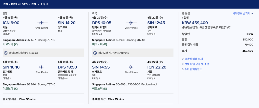 싱가포르항공 측은 보도자료를 통해 발리 42만 9300원부터, 푸켓 41만 6400원부터, 몰디브 노선은 81만원 부터 이코노미 왕복 특가를 제공한다고 밝힌 바 에디터가 직접 항공 요금을 검색해 본 결과, 실제 인천-발리 왕복 요금은 459,400원, 인천-푸켓 왕복 요금은 416,700원, 인천-몰디브 왕복 요금은 810,200원으로 발권할 수 있었다.